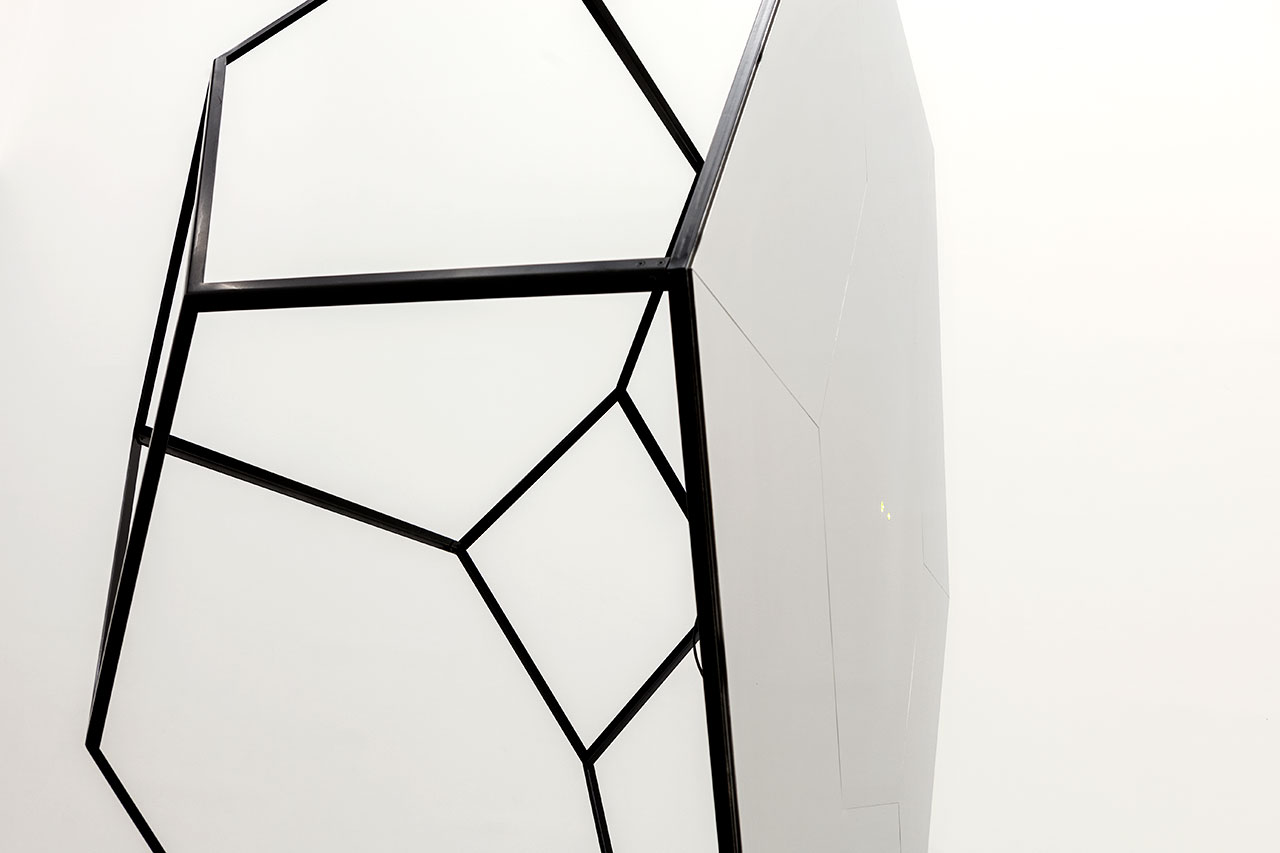 tele was inspired by the peculiarity of quantum entanglement. The installation's title refers to how Einstein described the phenomenon with the term „spukhafte Fernwirkung“ (spooky distant effect), whereby two quantum systems a long way apart in space share the same state: two particles are interconnected with each other that any change in one has a direct, immediate effect on the state of the other, as if there was a „telepathic“ connection between the two. tele consists of two large-format mirror structures in the form of a divided Archimedean body that are „in contact“ with each other via laser beams. The beams strike photocells that send out impulses to re-trigger the beams anew. This sets up a kind of feedback system linking the two objects through the lasers to establish „communication“. The laser beams dominate and define the exhibition space. Electromagnetic waves spread at the speed of light, and are perceived by the human eye as a stable, straight beam, thereby achieving a sculptural quality. Whilst the mirrors create the impression of an infinite continuity of the rays, as if a separate, alternative universe emerges – an autonomous system created by the artist. The laser beams can be perceived differently from various points of view, and changing perspectives on the sculpturally formed mirrors allow a variety of images to be created.
